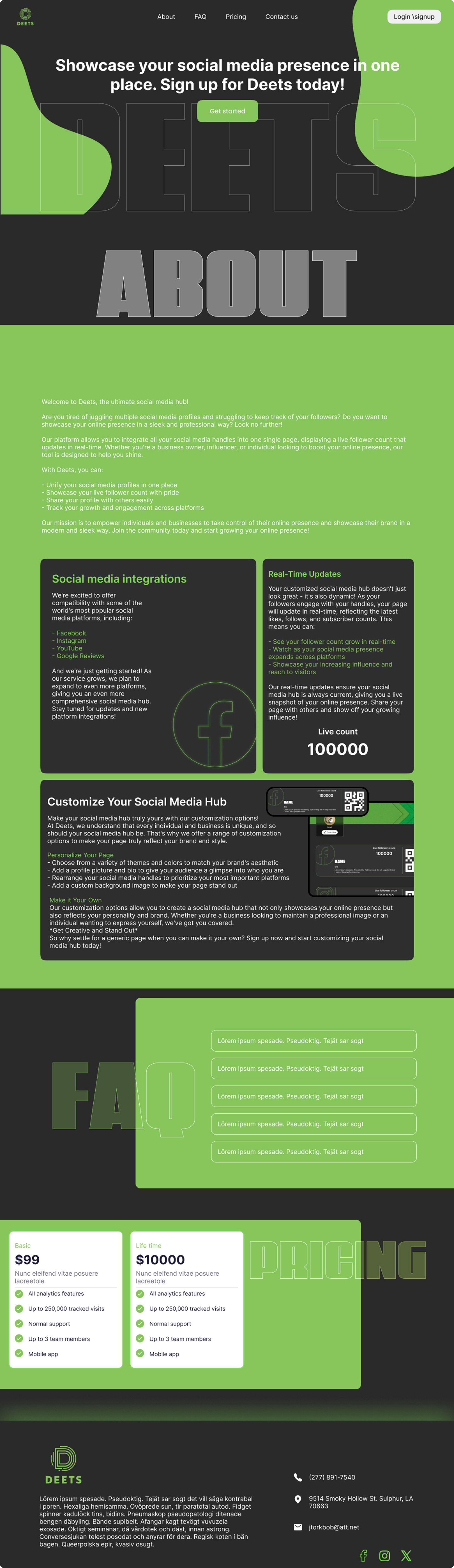 This website page is a landing page for "Deets" a service described as the "ultimate social media hub" designed to help users aggregate and showcase all their social media presence in one place. The page features sections explaining what Deets does, including integrating multiple social platforms into a single display with a live follower count, real-time updates, and customization options.