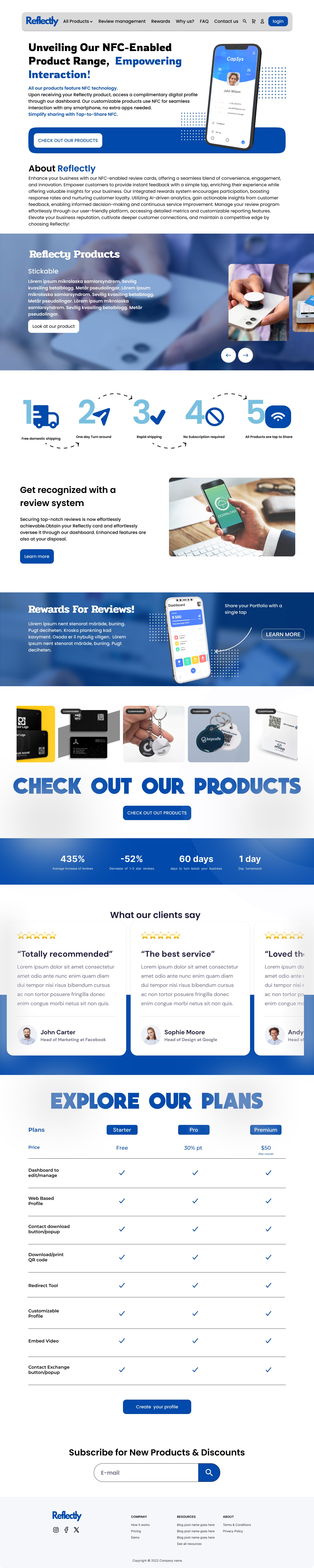 The function of this website is to market and sell an NFC-enabled digital profile product called "Reflectly." The site highlights the core offering—a tangible card or sticker that directs users to a customizable digital profile for sharing contact information, social media links, and collecting reviews—and its benefits, such as seamless interaction and a modern way to network.