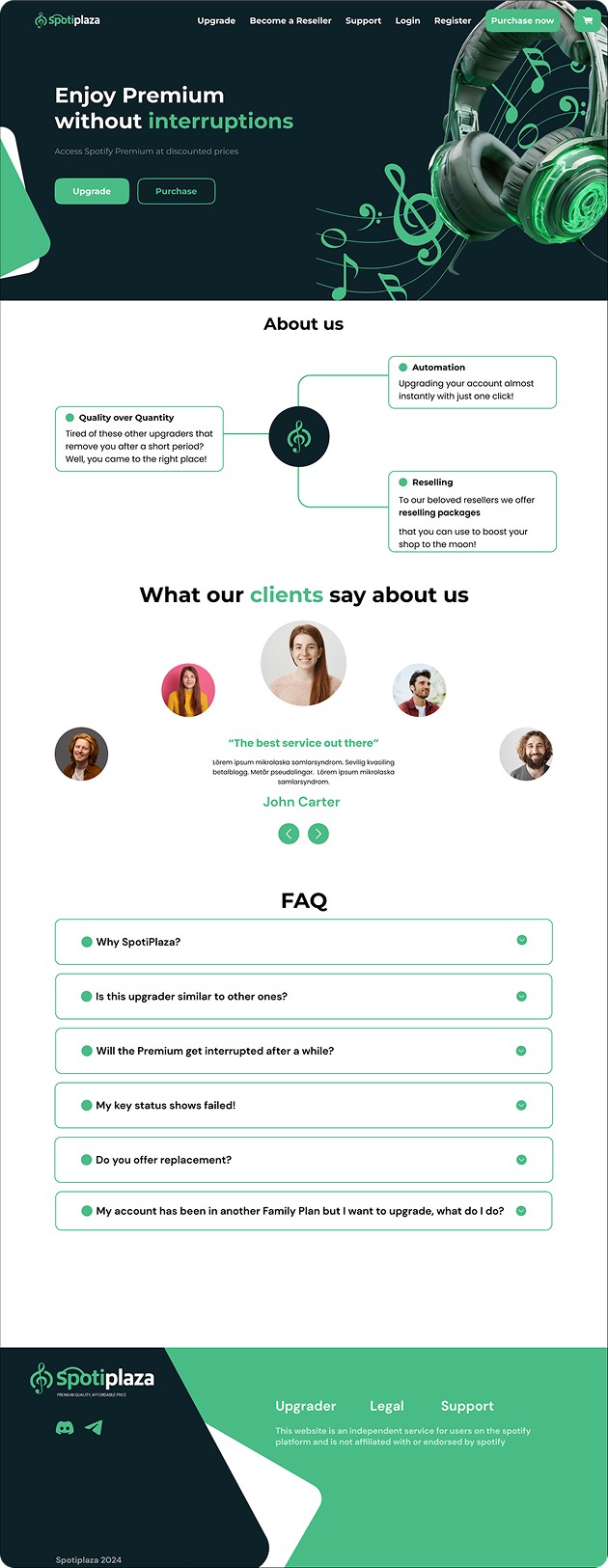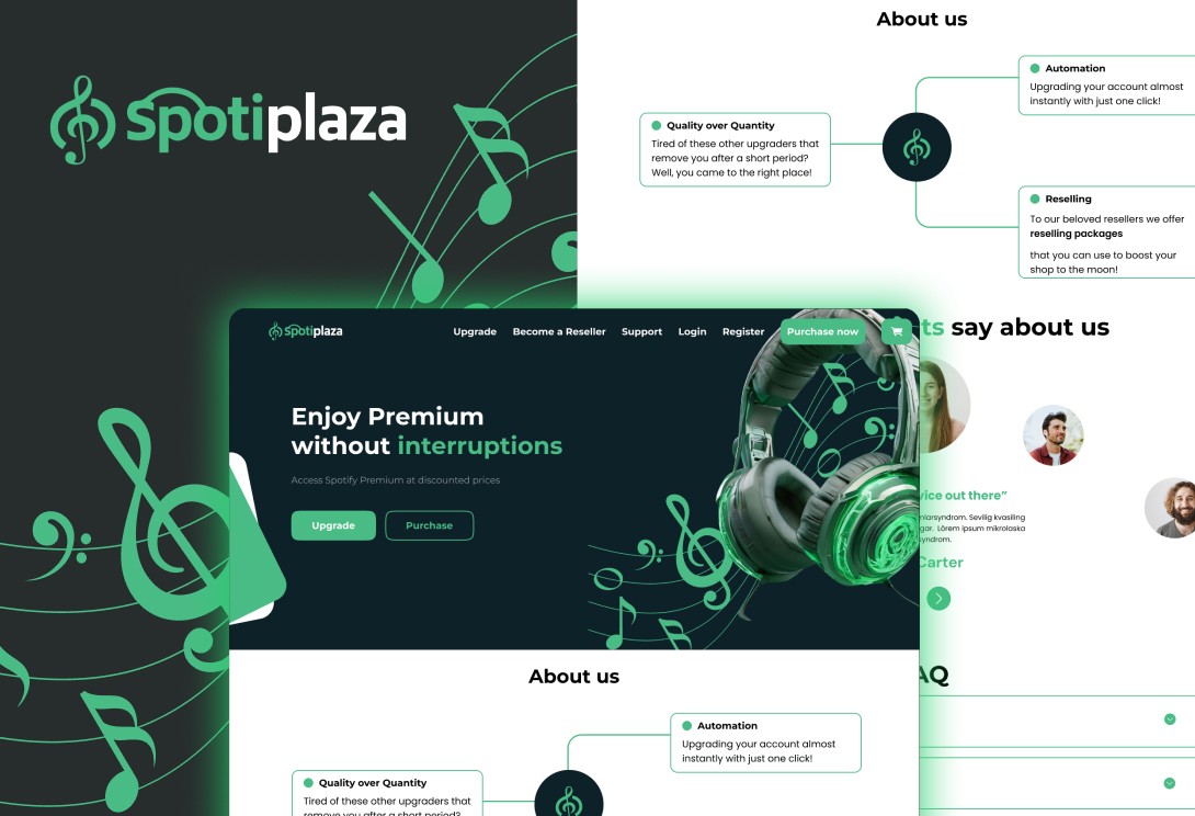 The image displays the landing page for SpotiPlaza, a service whose primary function is to offer Spotify Premium account upgrades to users, likely at a discounted price, and to facilitate a reseller program. The website is designed to convince visitors of its value through customer testimonials and an FAQ section that addresses common concerns like service reliability and replacements. Essentially, it operates as a specialized service provider focused on delivering and supporting Spotify Premium access outside of the official platform channels.